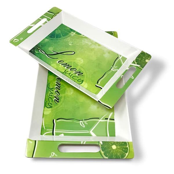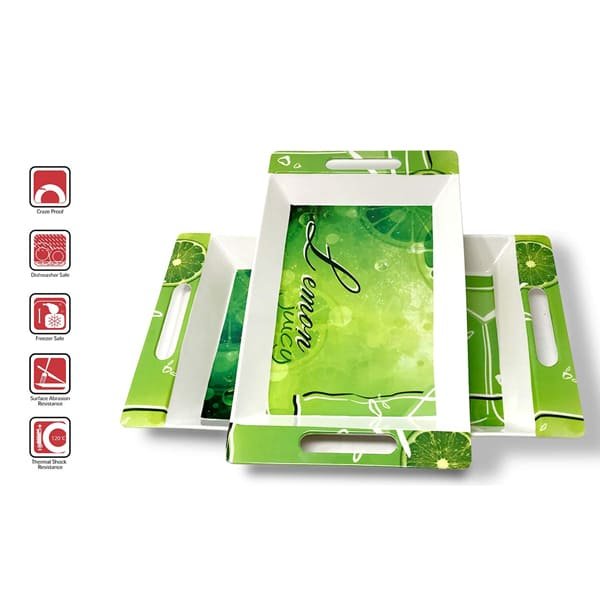 - Fade-Resistant Glazed Finish – melamine trays have a porcelain-like finish that is fade-resistant.