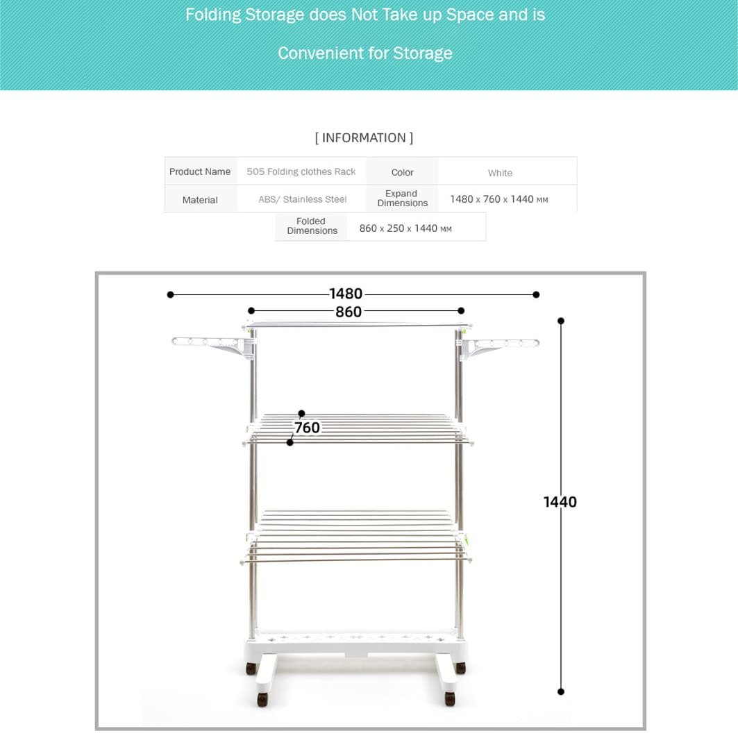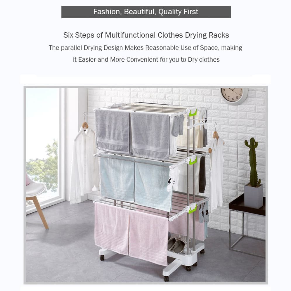 • With 3 tiers made up of 6 retractable trays, you can hang dry your laundry onto the multiple rails. 2 detachable side wings provide extra hanging space and the hanger slots design avoids clothing from falling down. The bottom grid shelves are convenient to store shoes, boxes, or laundry baskets. When not in use, it is foldable for storage without taking up significant space. 8 directional wheels with locking brakes allowing it to be moved from indoors to outdoors.