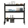 The rack features a built-in utensil holder and a spacious shelf for drying plates, bowls, and other dishes.
