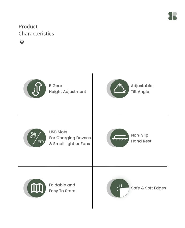 - Features: Angle adjustment, 5 levels of height adjustment, USB hub that supports up to 2 Amp. current, Smart USB night lamp, Smart USB fan