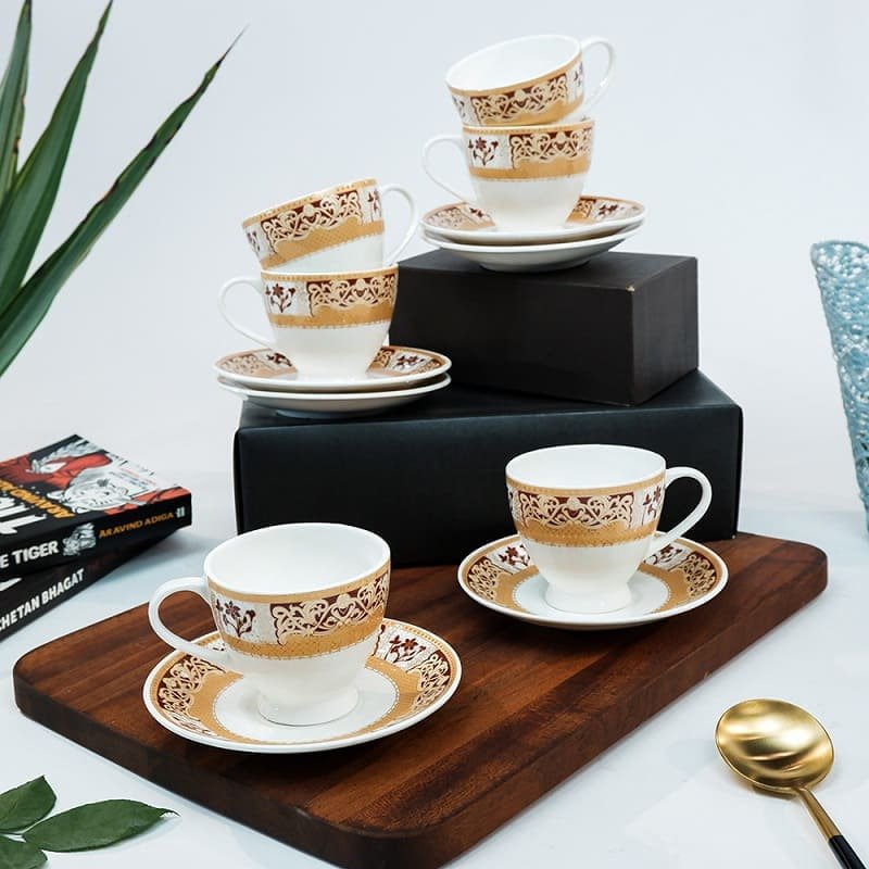 Our teacup and plate set is not only functional but also aesthetically pleasing. The beautiful design and vibrant colours add a touch of elegance and style to your home decor. Impress your guests and enjoy your morning beverages with our ceramic cup and saucer set. It also makes a perfect gift for any occasion, from housewarming parties to weddings.