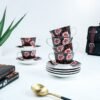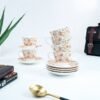 Introducing our beautifully crafted floral teacup and saucer set, the perfect addition to any kitchen or dining room. Our set includes cups and saucers, each uniquely designed with intricate patterns and a glossy finish. Made with high-quality ceramic materials, our cups and saucers are durable, dishwasher safe and perfect for daily use.